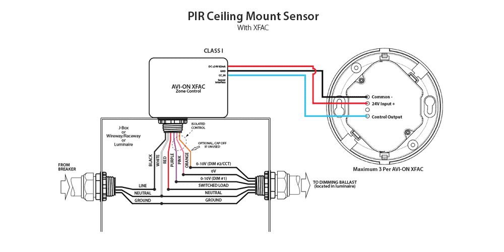 The Avi-on PIR Ceiling Mount Sensor is powered by and sends its signal to the XFAC (AVI-XFAC-16A-1CH-CL1) or Avi-on Sensor Input Module (AVI-SIM-12-24VDC) with a power supply (AVI-PSR20-277-24-150). The sensor is factory preset to allow for quick installation right out of the box in most applications. Lighting configuration should be done through the Avi-on App. Manual adjustments can be made physically on the sensor’s face.